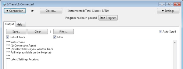 If the InTrace agent which you connect to was started with the argument [startwait then the UI will change to look like the following screenshot when you first connect.